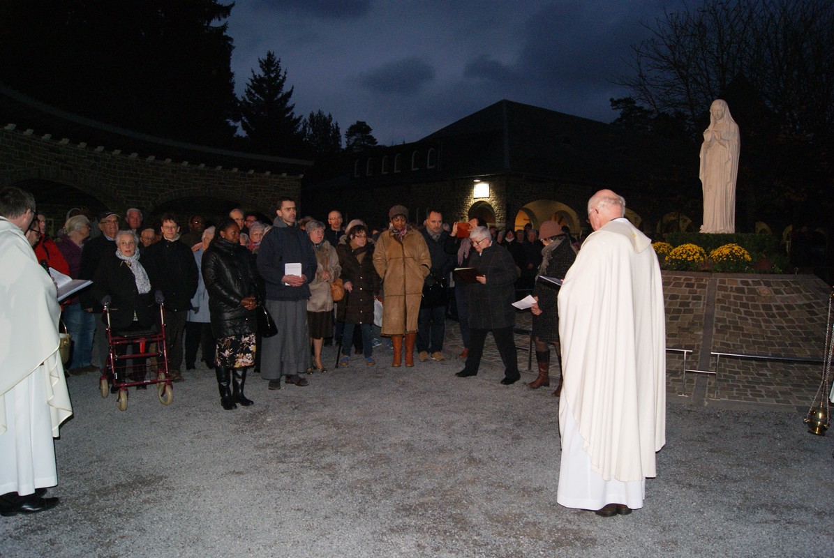 Après la célébration eucharistique dans la Chapelle du Message, l’assemblée s’est réunie près de la statue de la Vierge bénissant, tournée vers la Porte Sainte.
