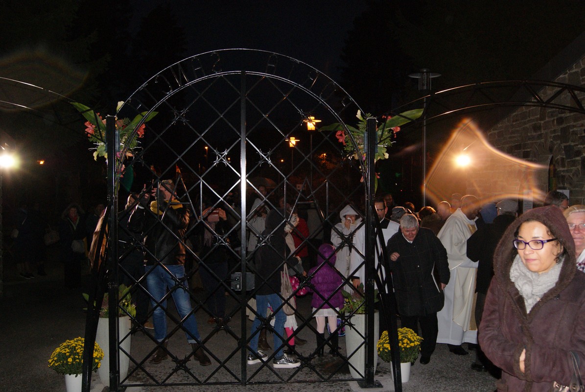 Deux prêtres, après avoir eux-mêmes passé la Porte, bénissent les pèlerins qui passent la Porte Sainte, en direction de la chapelle des Apparitions, et leur offrent le signet rappelant les œuvres de Miséricorde.