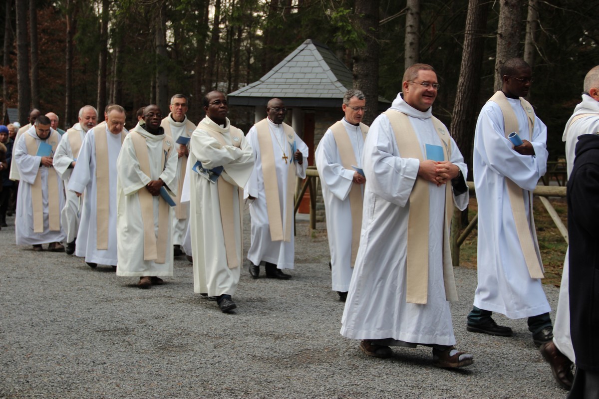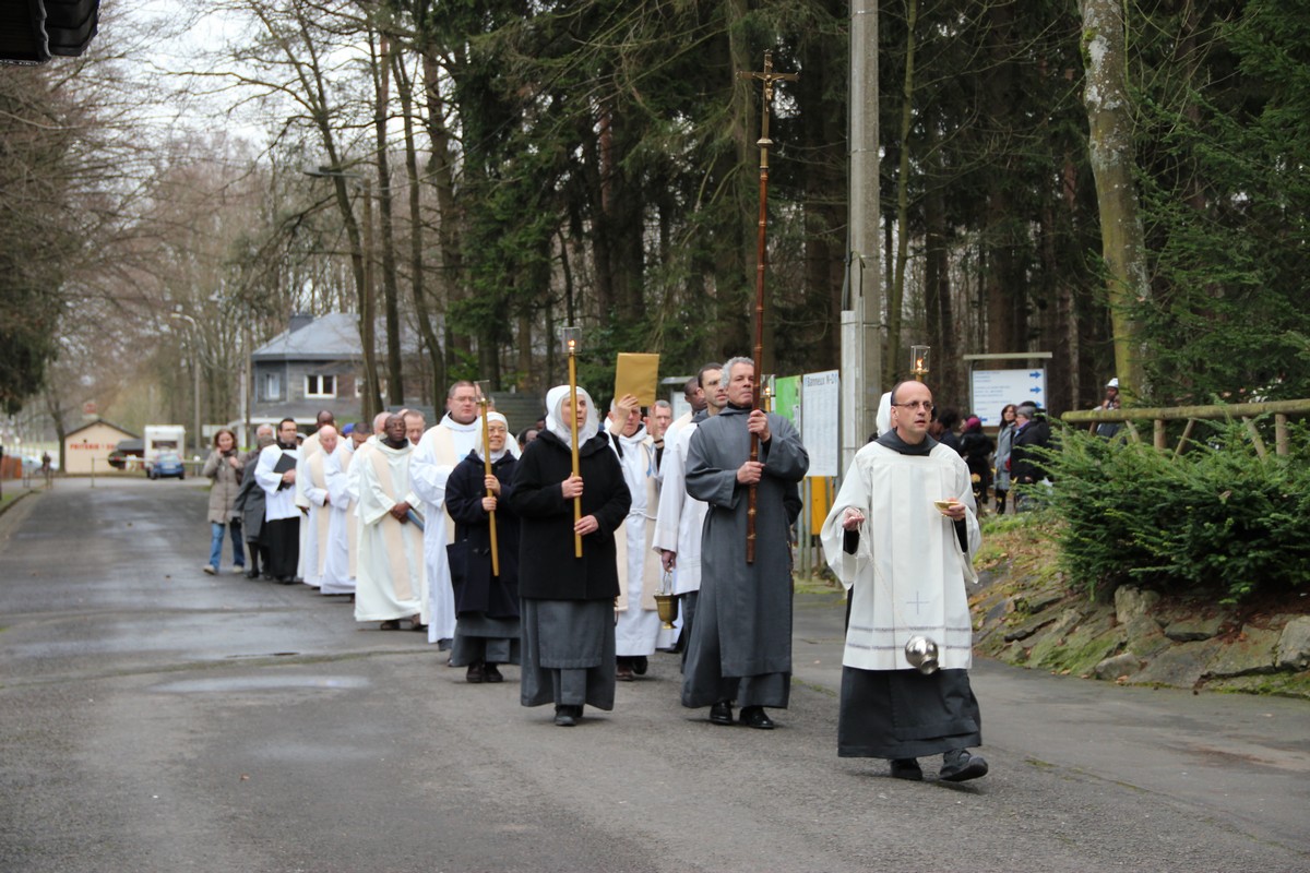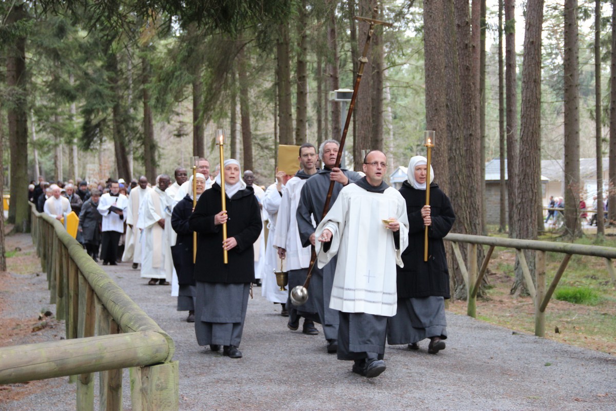 La procession s’est mise en route depuis la chapelle du Message. Devant les célébrants, on comptait des frères et sœurs de Saint-Jean : un thuriféraire (porteur de l’encensoir), suivi d’un porteur de la croix, de quatre sœurs portant des flambeaux, et d’un prêtre portant l’évangéliaire (le livre de l’Évangile).